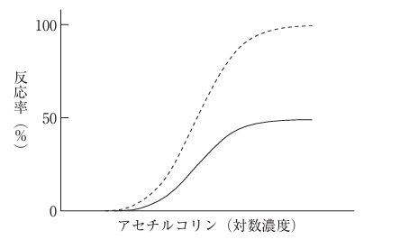 設問の図では、薬物X存在下のアセチルコリン濃度–反応曲線(実線)が