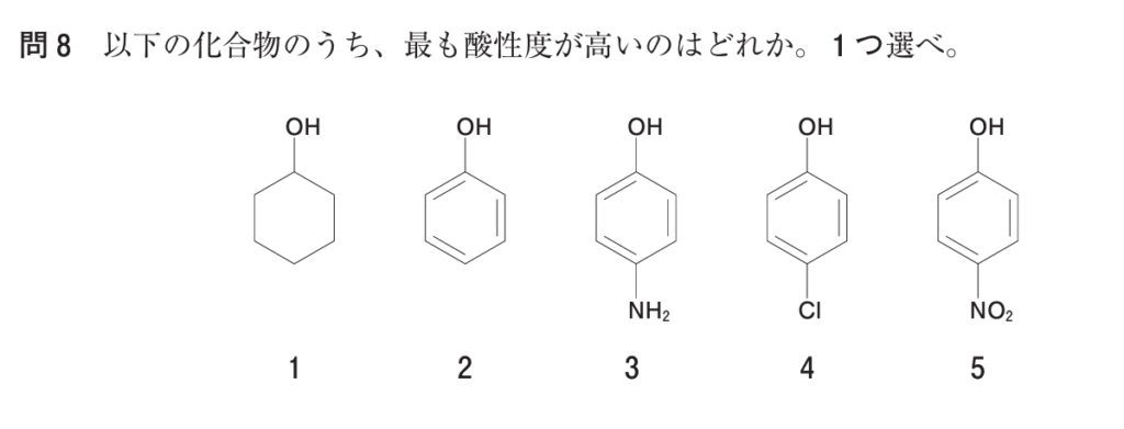 第110回薬剤師国家試験 問8 酸性度の比較(置換基の電子効果)