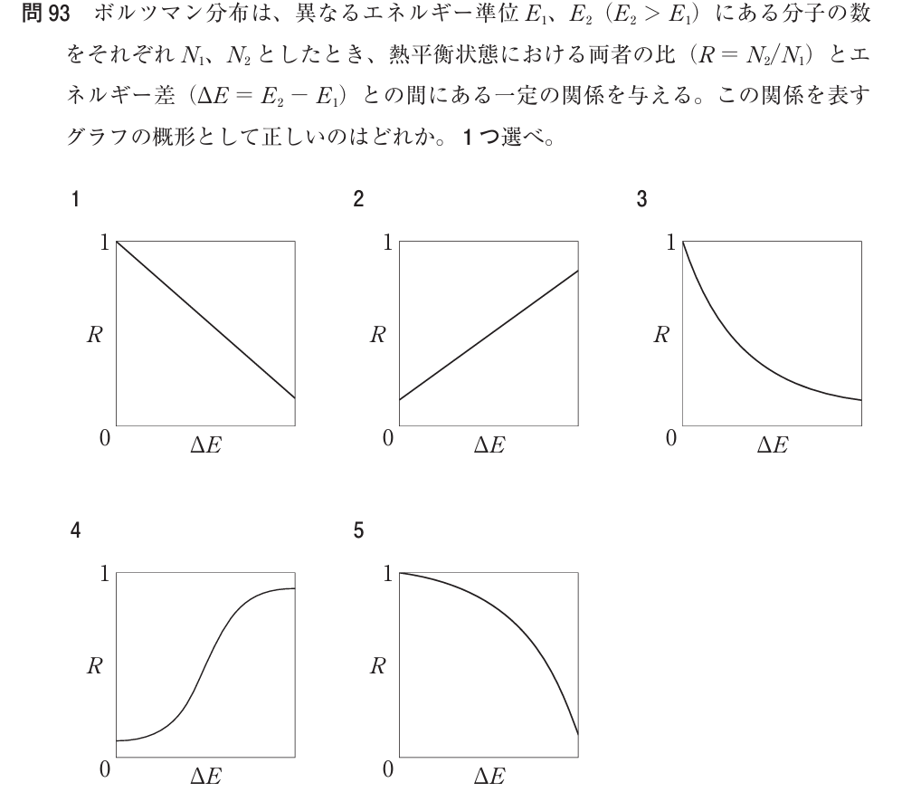 1:直線的に減少 → ボルツマン分布は指数関数なので誤り。