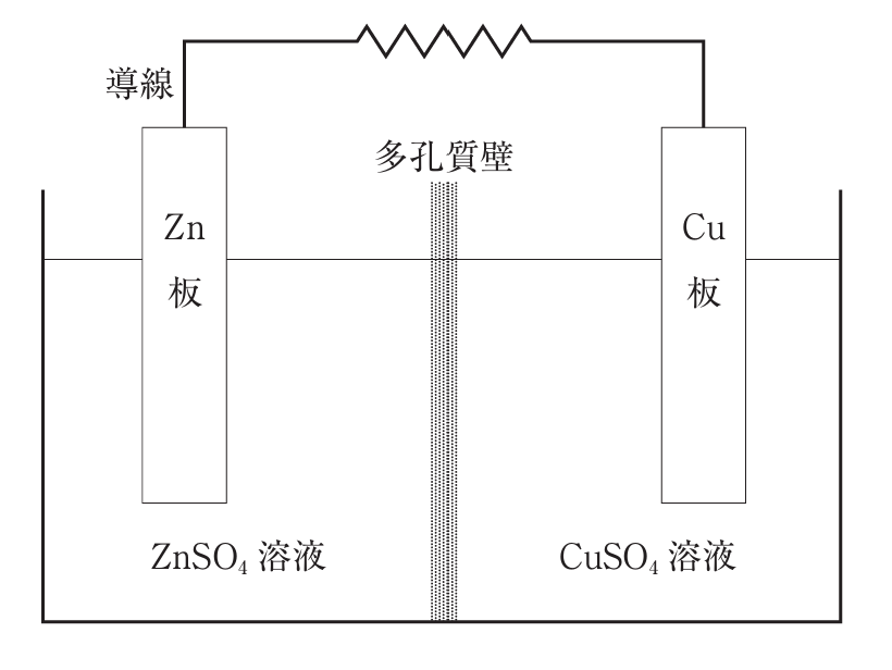 ダニエル電池は、亜鉛電極(Zn)を硫酸亜鉛溶液(ZnSO₄)に、銅電極(Cu)を硫酸銅溶液(CuSO₄)に浸し、両者を導線と多孔性隔壁で接続した構造をもつ電池である。